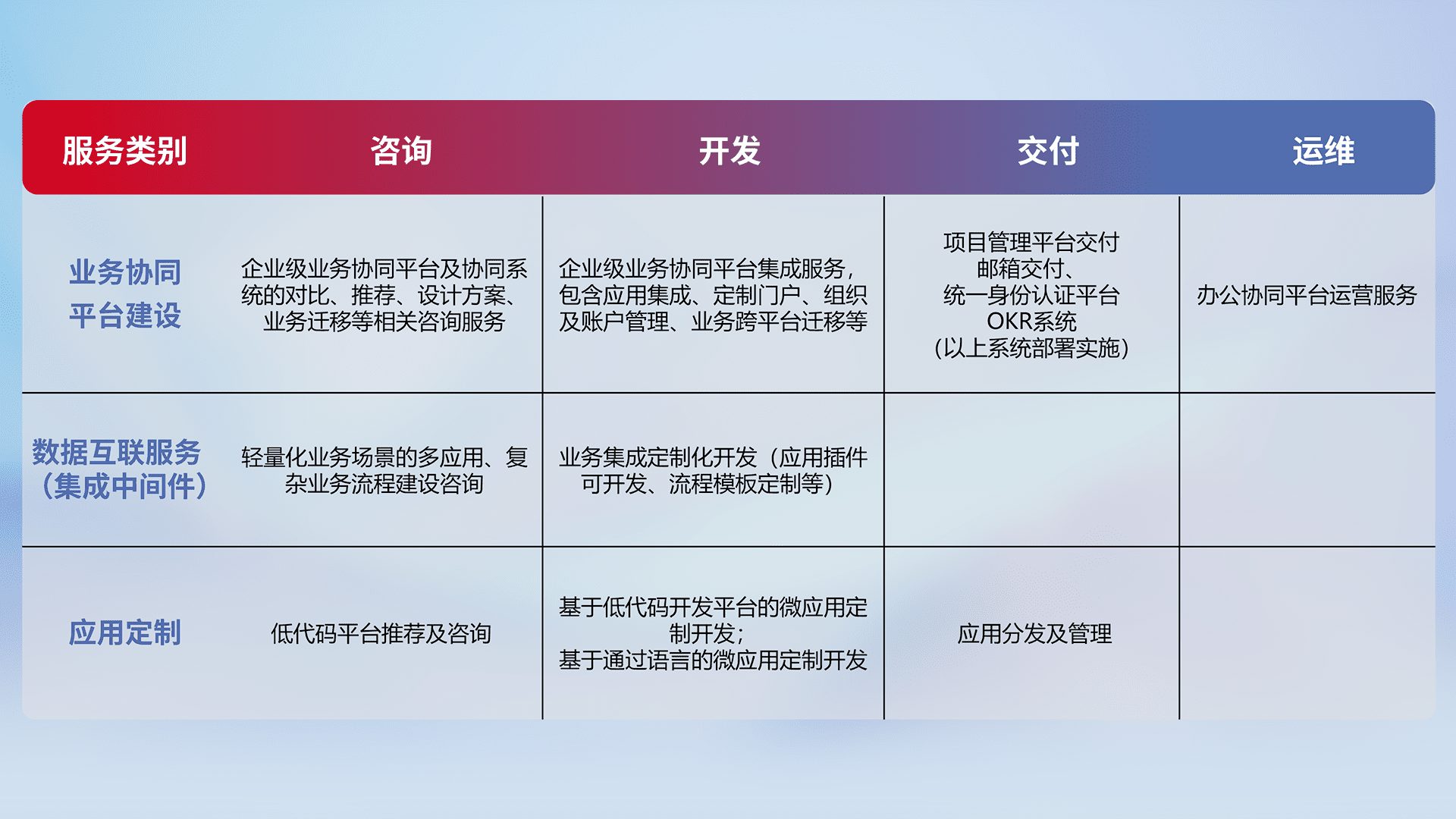 针对钉钉、、、企微、、、IDaas等平台级产品提供产品的规划、、、方案、、、交付、、、定制化开发等服务,,,实现如统一协同办公、、、、智能客户服务、、、、混合会议管理、、智能数据查询、、、、等业务场景,,,实现数字化转型。。。