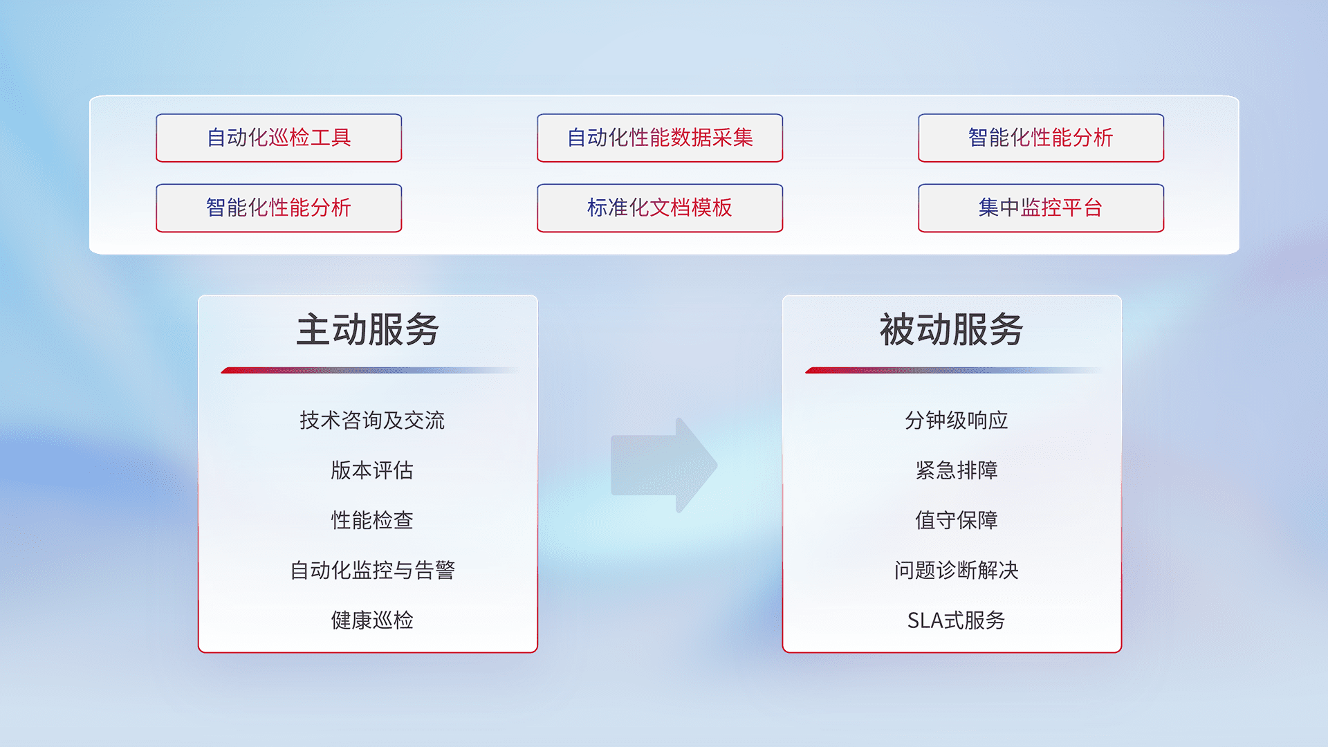 智能化工具和标准化文档,,保障服务质量,,,提供主动服务(包含技术咨询、、、、版本评估、、、、性能检查、、、自动化监控与告警、、、、健康巡检)和被动服务包含(分钟级响应、、、紧急排障、、、值守保障、、、问题诊断解决、、、SLA服务)。。