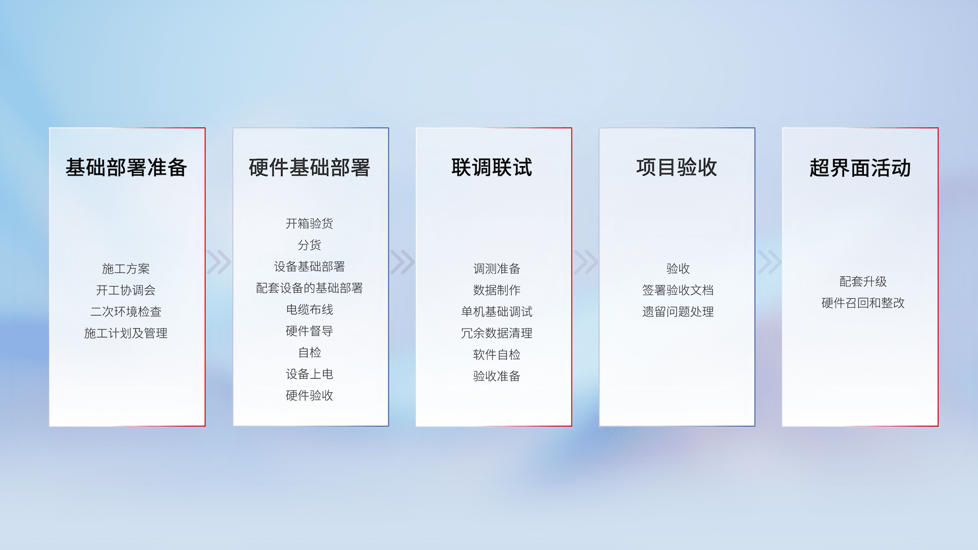 从基础部署准备、、、硬件基础部署、、、、联调联试、、项目验收、、、、越界面活动的全过程可追溯,,,,保证施工质量和进度。。。